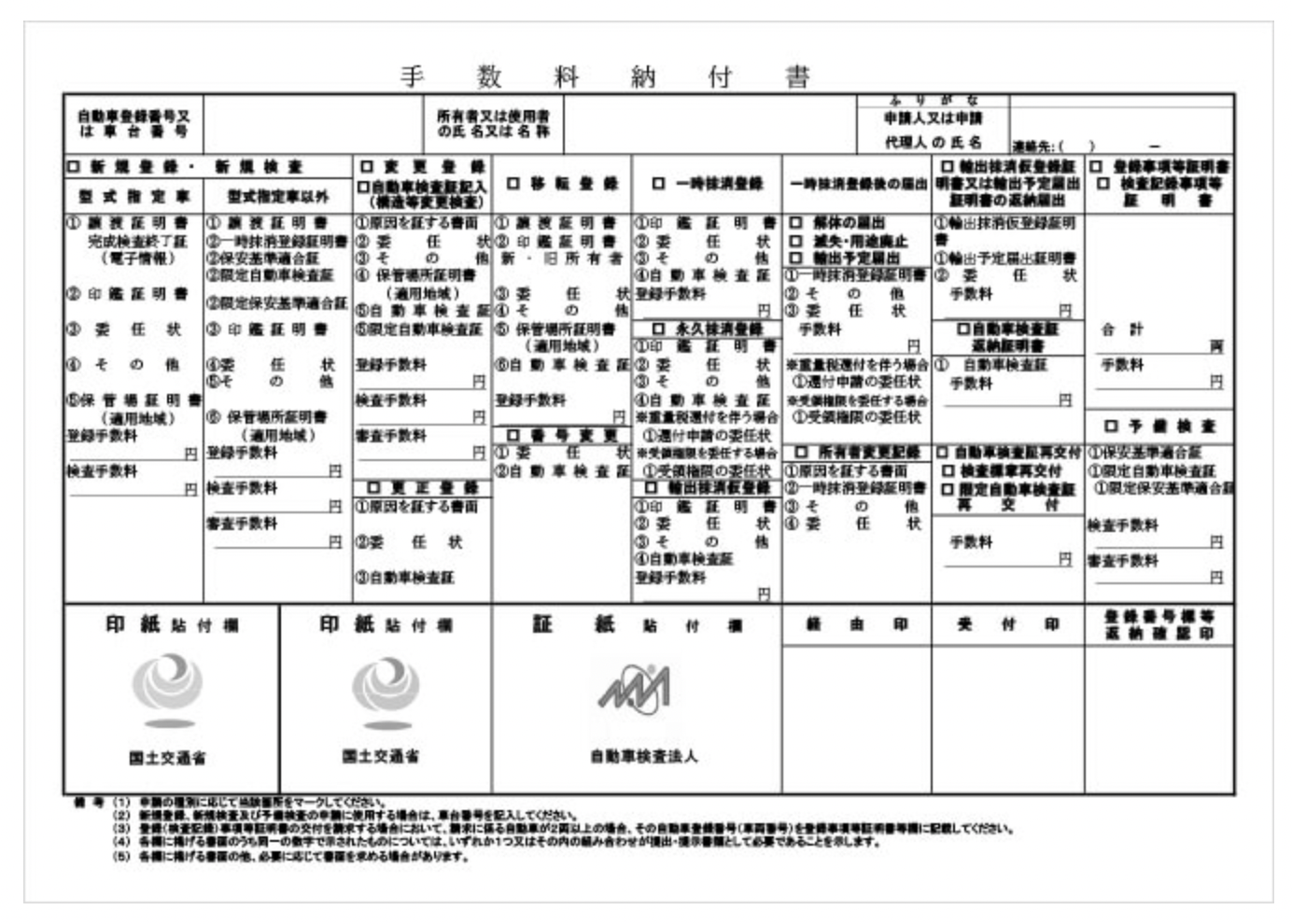 5.車検証 (自動車検査証) 元・所有者から継続の車検証を陸運局で名義を書き換える。 6.手数料納付書、自動車税申告書、申請書 陸運局に用意されています。