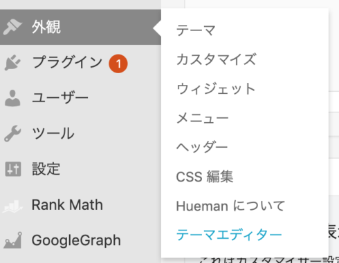 WP5.0以降では、【外観】>【テーマエディター】の右側カラムに、【header.php】がある。