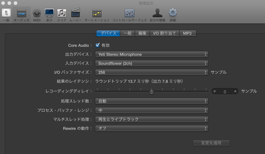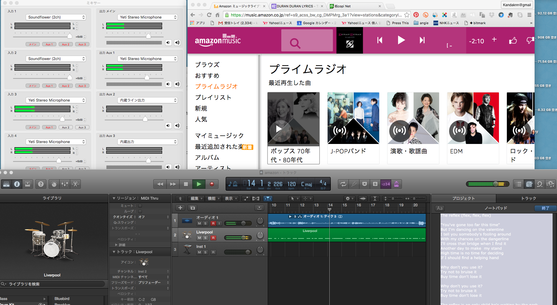 入力にel capitan用の新たなSoundflowerとYetiMicでPC音とボーカルが、Yetiのスピーカーアウトからヘッドフォンで確認。