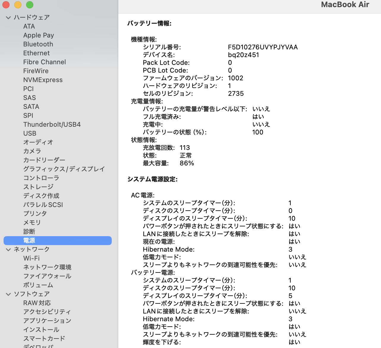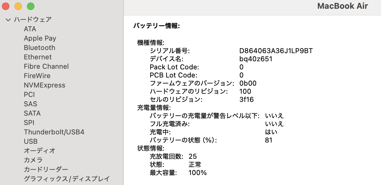 そして、左カラムの『ハードウェア>電源』を見ると、『バッテリー情報』が示される。