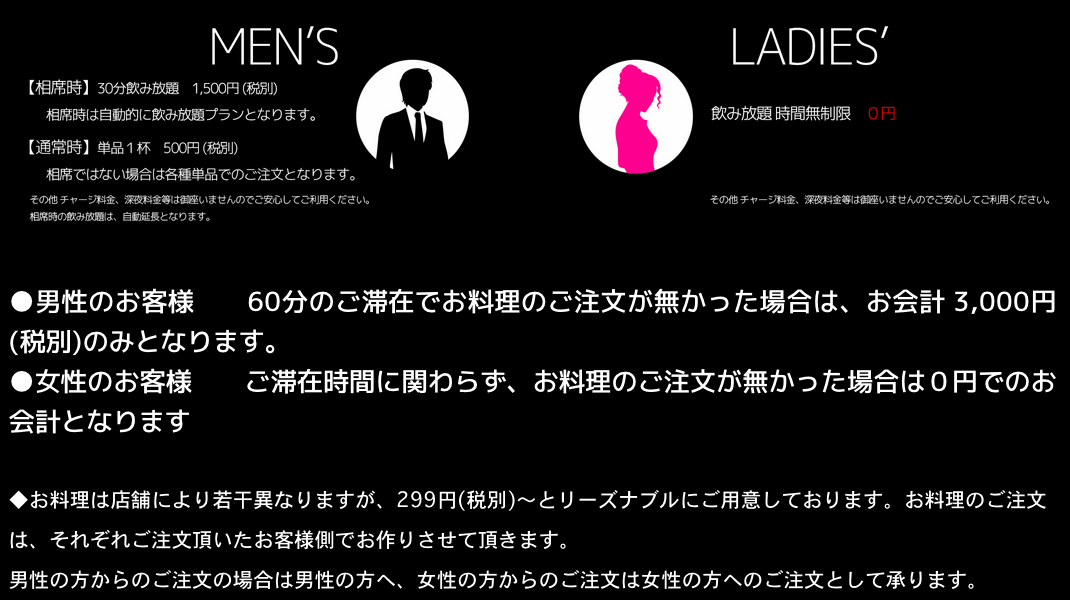 女性は飲み放題。しかし、相席にくる男性を相手にしてねという意味だ。