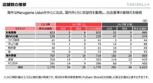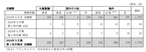 丸亀製麺 832店舗 国内その他229店舗 FC4店舗(FC率1.7%) 国内はほぼ直営店舗のみ 国内合計1061店舗 海外718店舗(FC率55%)