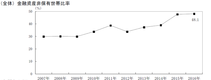 ❏10人のうち、1人か2人は預金口座にお金がないまた「金融資産を保有していない」との回答は調査対象(2500人)の48.1%(昨年は47.6%)に上った(下図参照、同)。