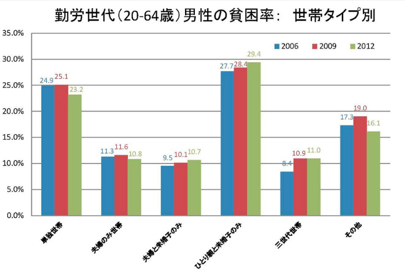 こちらのグラフを見ると、単身男性と未婚の子供世帯(シングルファーザー世帯)の貧困率が29.4%と3割近くなっている。