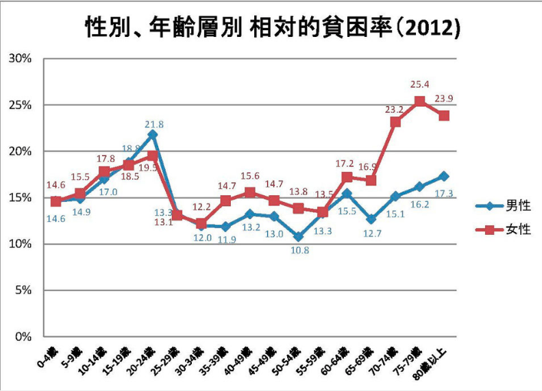 女性の75~79歳の貧困率が25.4%勤労世代男性20-64歳の世帯別貧困率