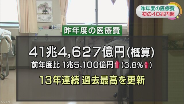 情報源: 医療費 初の40兆円超13年連続過去最高更新 | NHKニュース