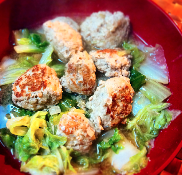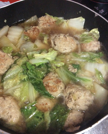を入れ、焼いた豚ひき肉ボールを煮込みます!