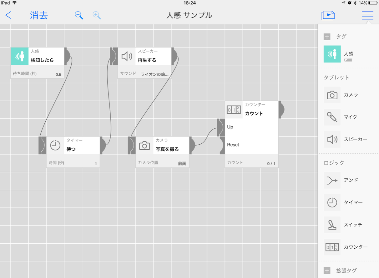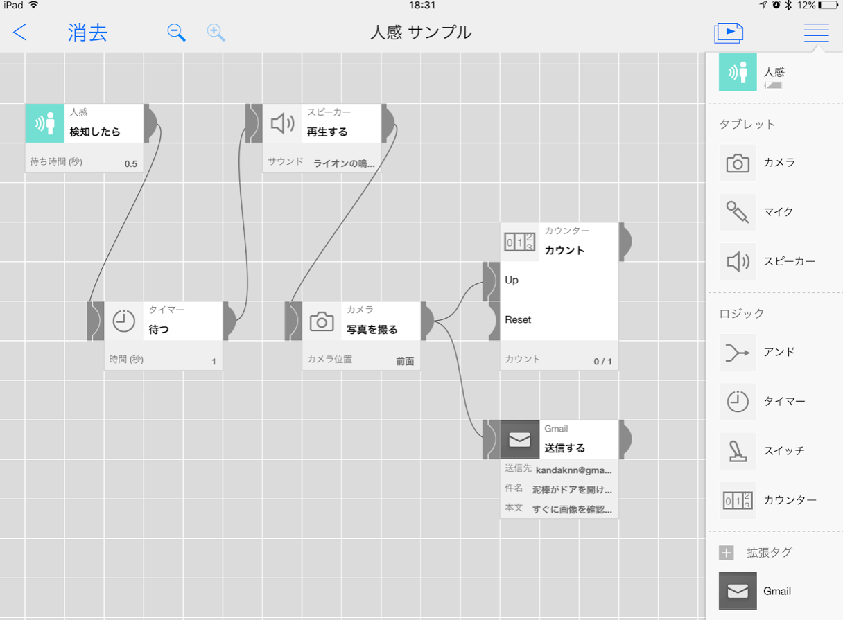『人感センサー』が検知したら、タイマーで1秒待ったあと、ライオンの声でサウンドがiPad miniから鳴り、iPad miniの前面カメラで写真を撮って、カウンターに何人目かを記録する…という防犯システムのプログラム。