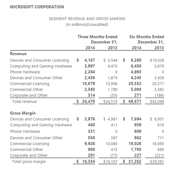 REDMOND, Wash. — January 26, 2015 — Microsoft Corp. today announced revenue of $26.5 billion for the quarter ended December 31, 2014. Gross margin, operating income, and diluted earnings per share (“EPS”) for the quarter were $16.3 billion, $7.8 billion, and $0.71 per share, respectively.