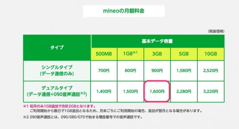 3GB 1600円 税抜き 1728円税込み