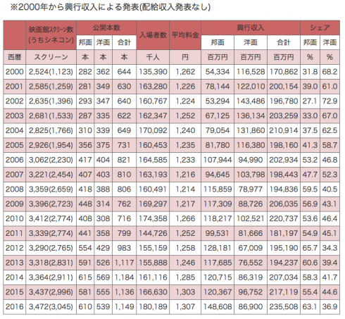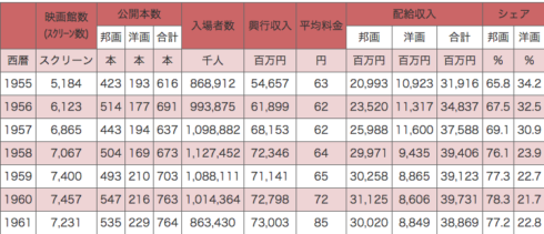 スクリーン数は、1950年代の6割。公開本数は2倍。入場者は2割。映画料金は2000%アップの平均1307円。