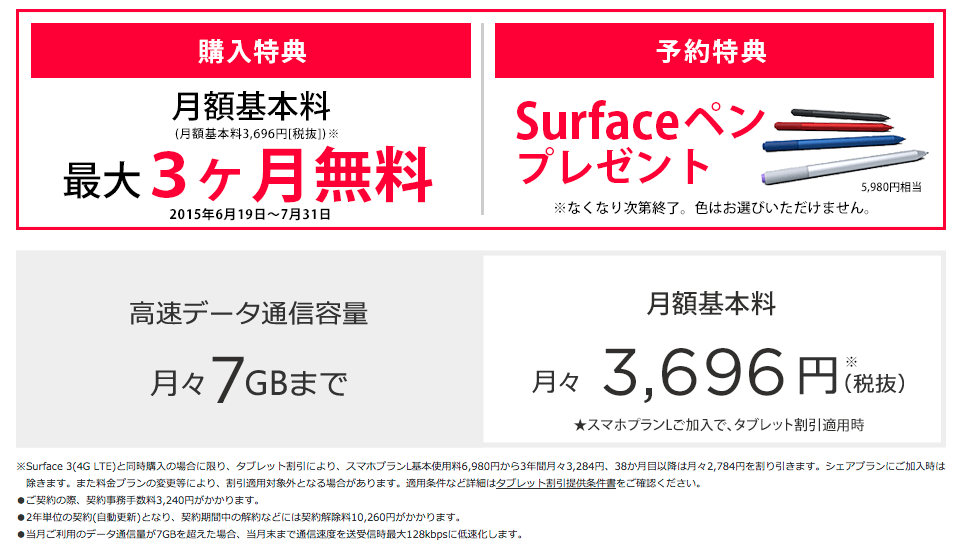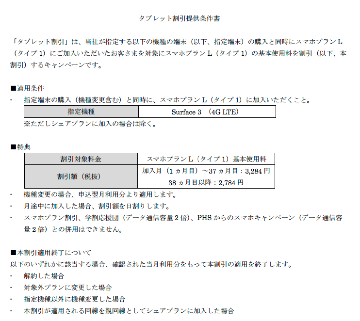 おっと… Surface3そのものの分割込みプランはないのか…。そこはマイクロソフトは損をしてもバラまくべきだろう。本体を通信費から割引くプランがあれば、PC離れしているスマホユーザー層にとってのファーストパソコンになる可能性があるのだから。