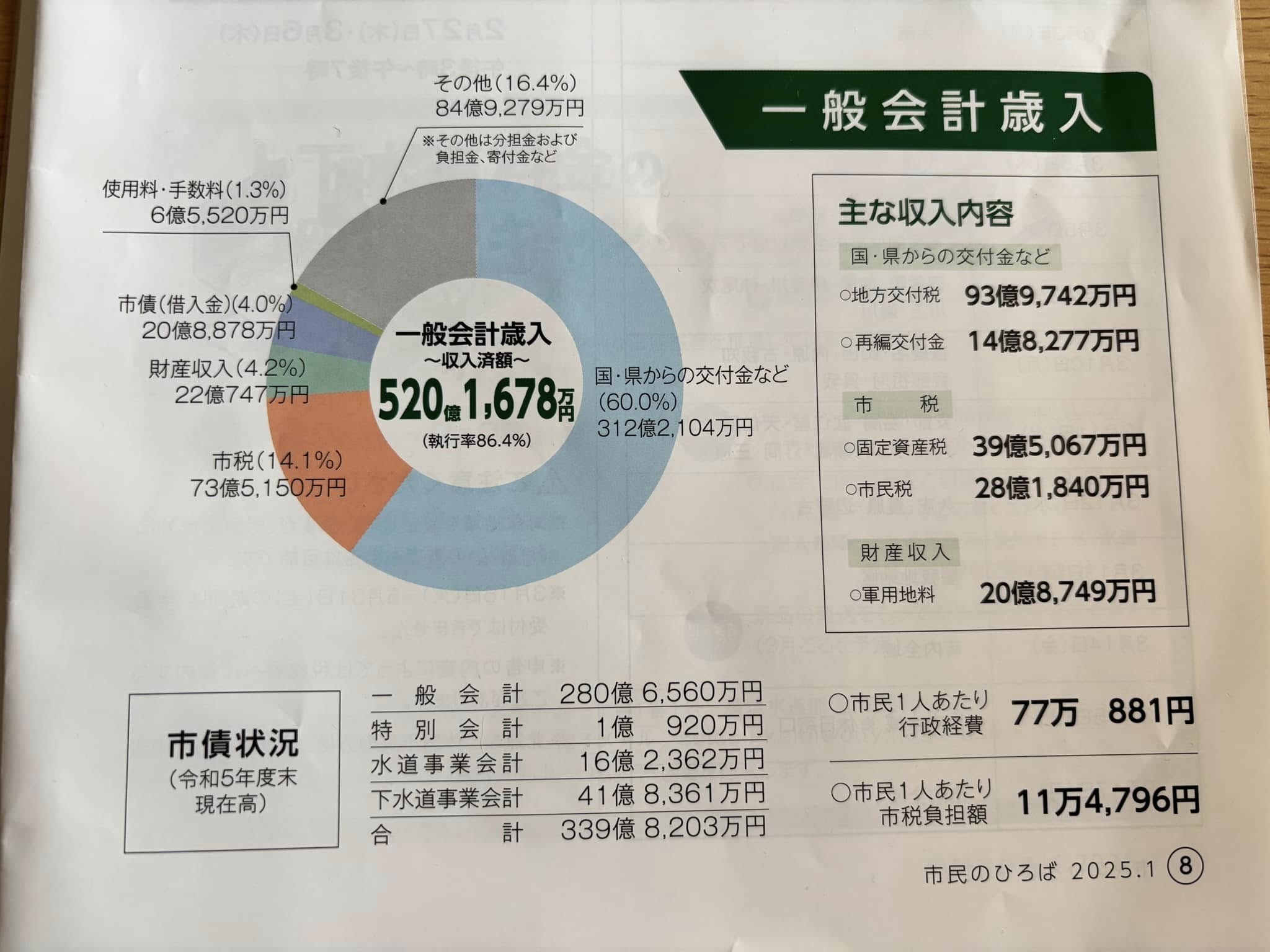 – 市債(借入金)残高が339.8億円あり、一人当たり約53万円の債務となっています