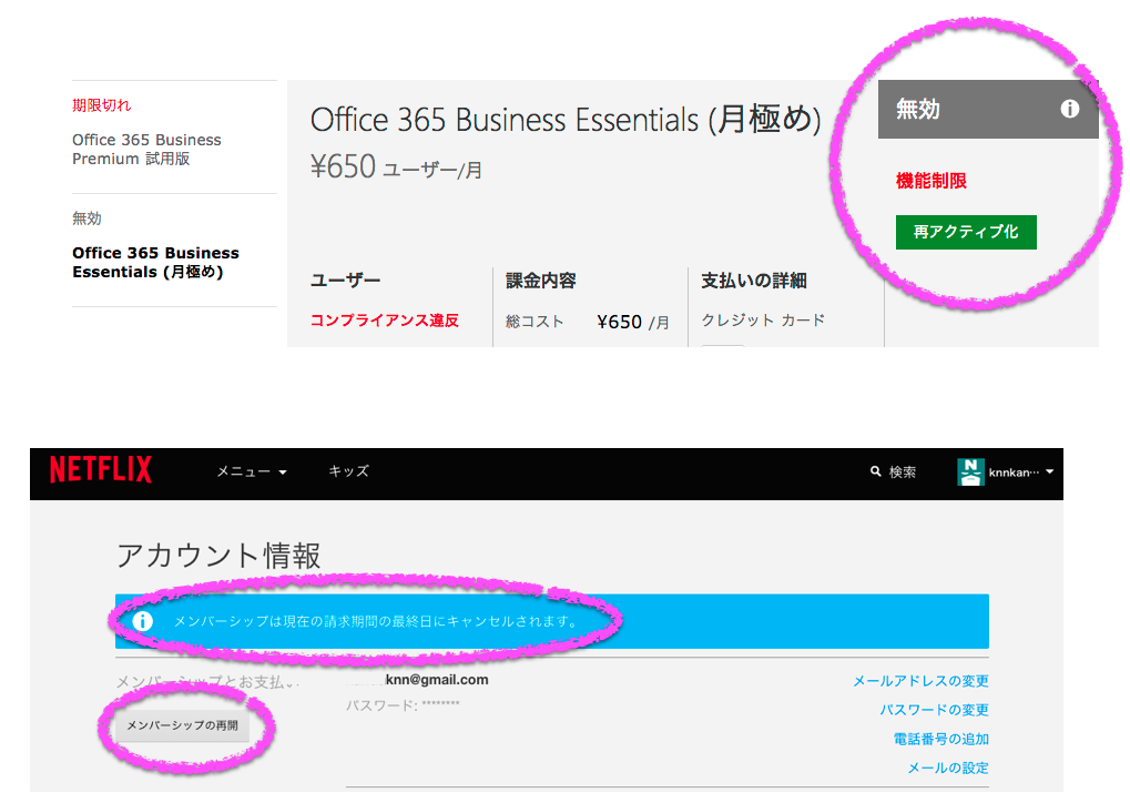 そして、解約したユーザーには、主語がないまま『無効』とか『機能制限』というネガティブなワードが露出している。