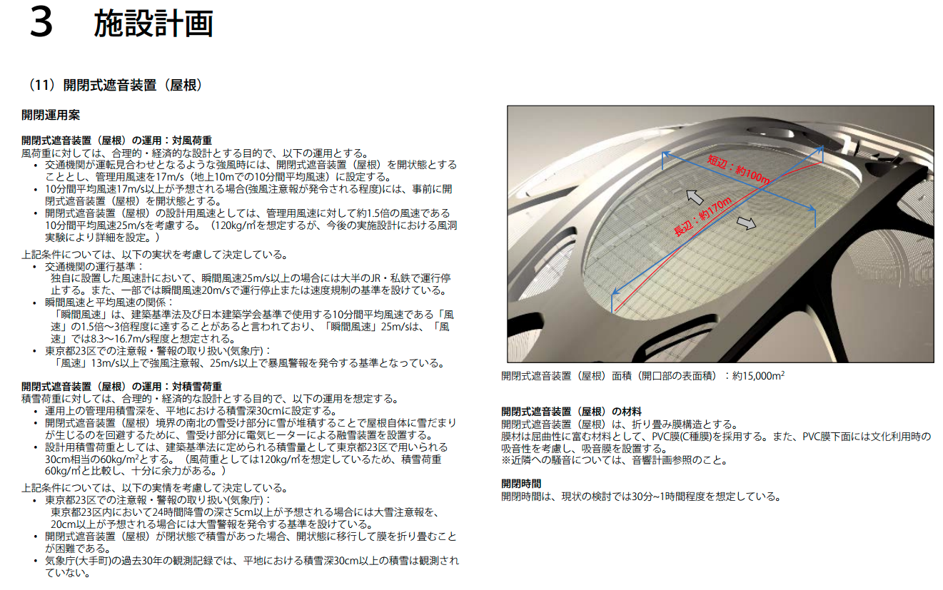 ❏2012年11月、イラク人の女性建築家ザハ・ハディド氏が手がけた開閉式の屋根をつけるデザインが採用され、費用は1300億円と見込まれた。しかし2020年東京大会決定後の13年10月、費用が当初の2倍を超える3000億円に上ることがわかった。