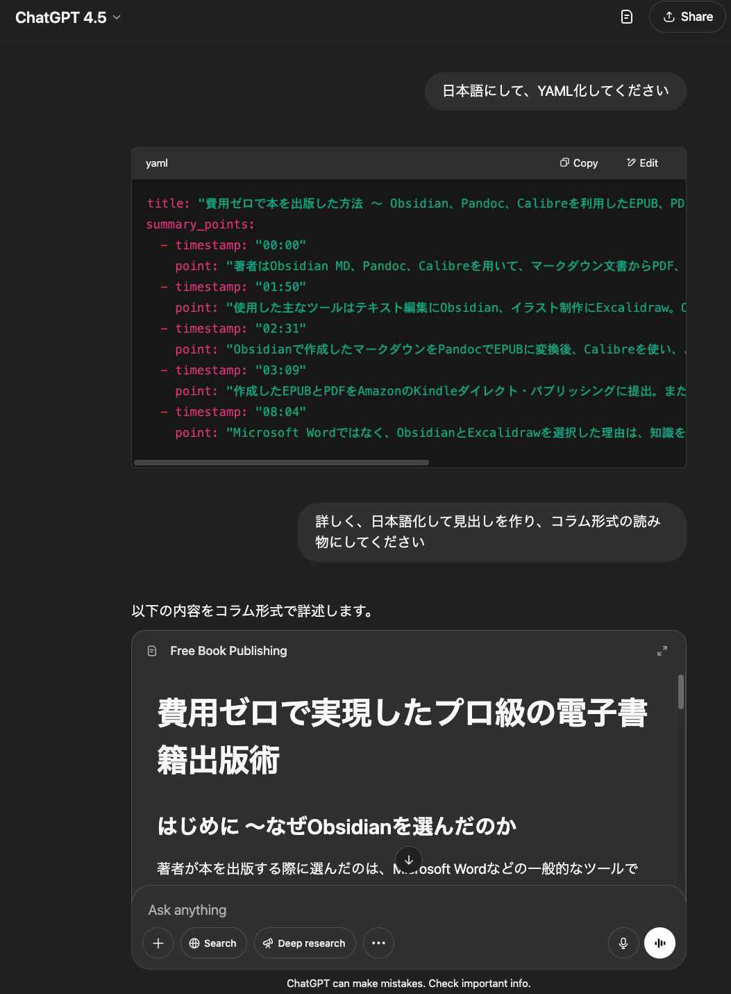 point: "著者はObsidian MD、Pandoc、Calibreを用いて、マークダウン文書からPDF、EPUB、オーディオブックを無料で自費出版した。"