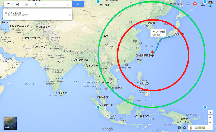さらに沖縄と北海道までの日本国土の同心円で考えると、