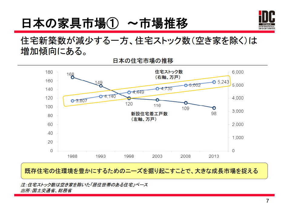 住宅ストック数が増加 ニーズの掘り起こし需要はある。新築のようなまとめ買い需要は見込めない。単品売り、高額でも機能とデザインがふさわしければありだろう。