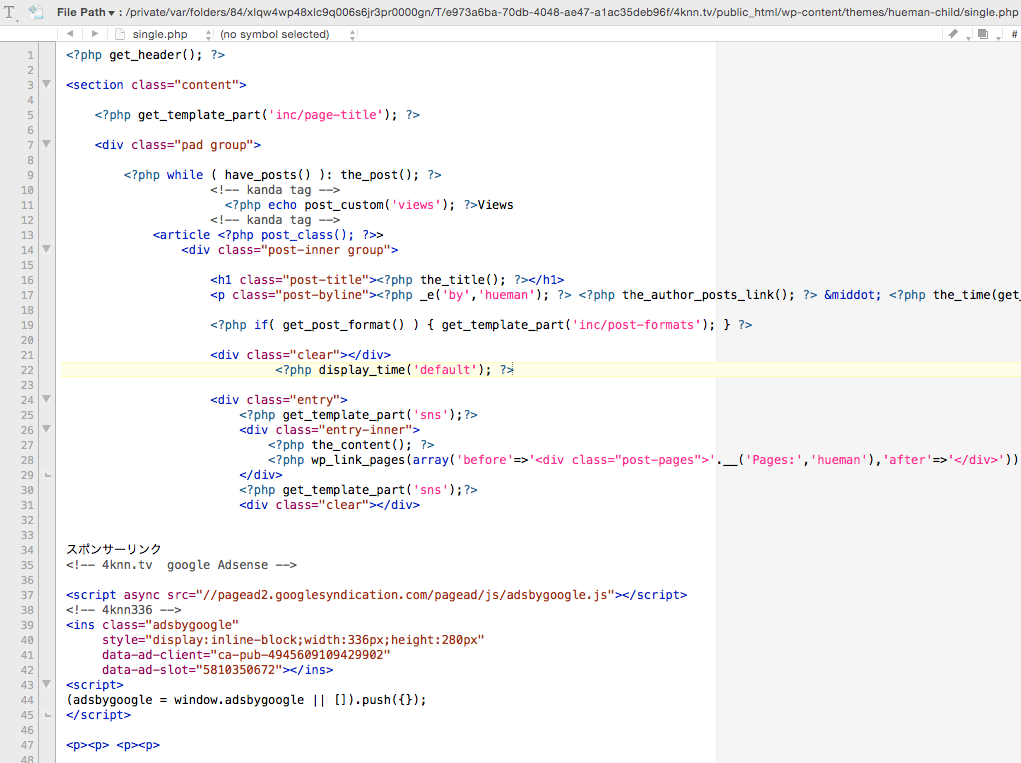 表示用のコードですが、記事ページで使う場合は、single.phpの任意の場所、ループ外でも大丈夫です。カスタム投稿や固定ページでも同じく任意の場所です。
