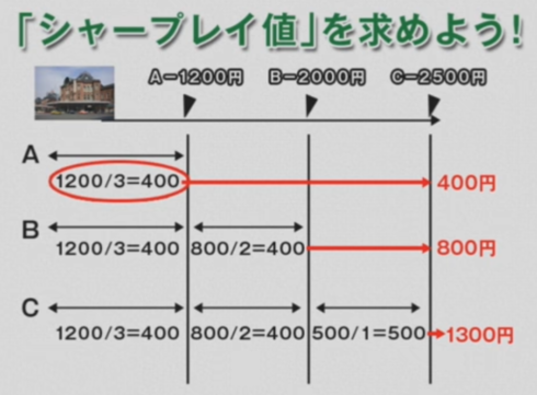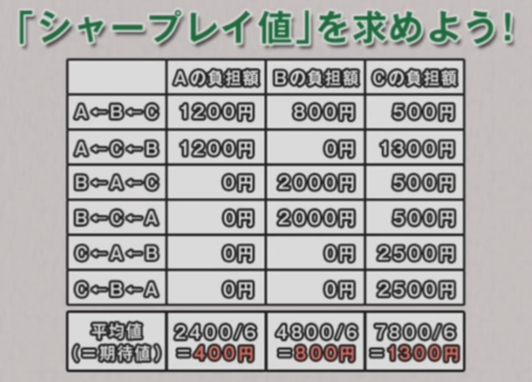 これらを平均化すると、Aのシャープレイ値は300となります。