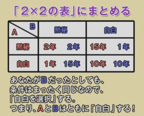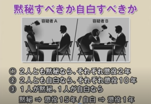 容疑者は、二人とも『自白』を選び10年の刑をえらばざるをえなくなった。