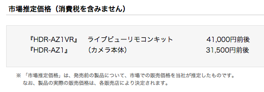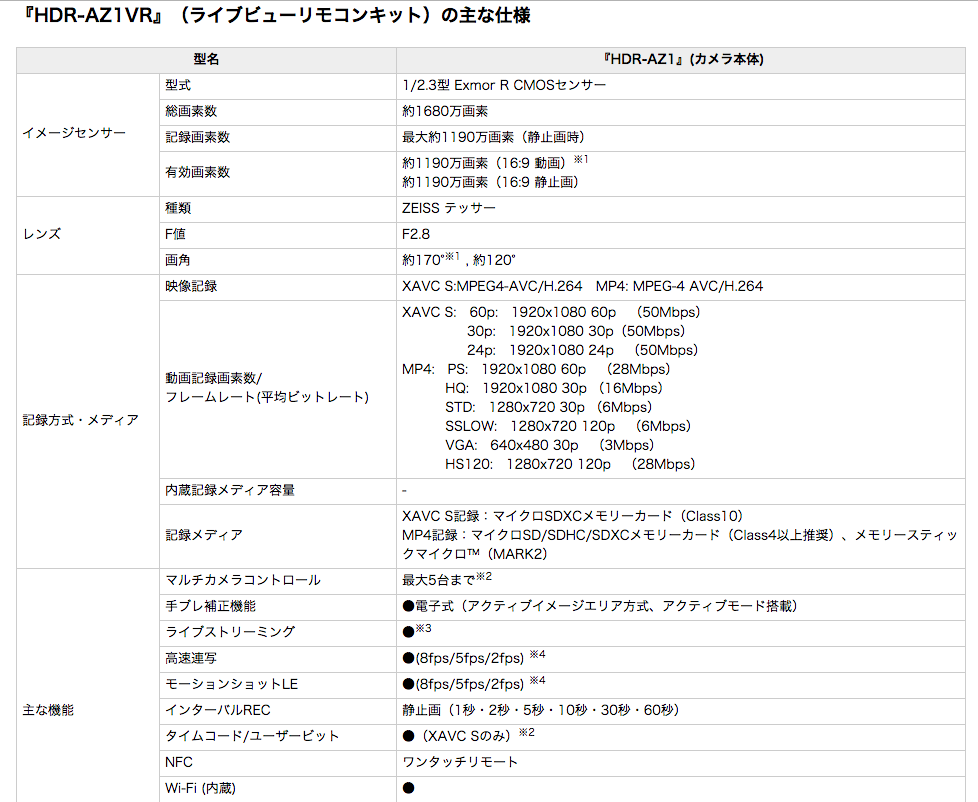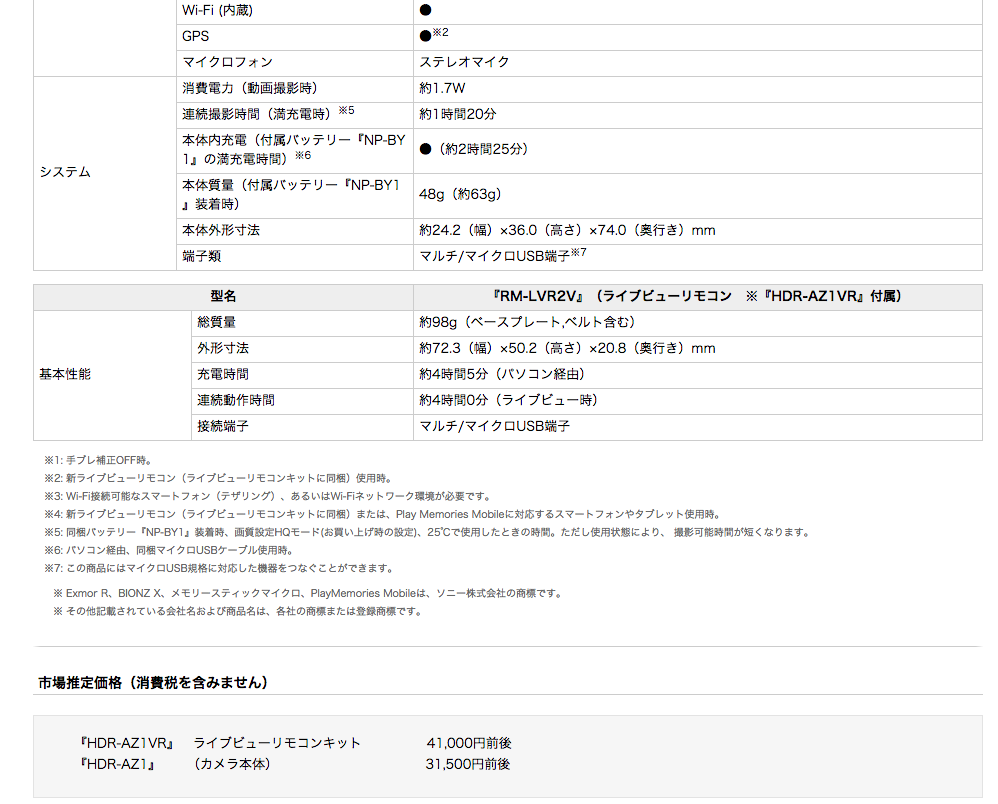 本体質量(付属バッテリー『NP-BY1』装着時) 48g(約63g)ソニーは、本体の奥行き約74.0mm・幅約24.2mm・高さ約36.0mmで、質量約63g(バッテリー装着時)を実現した防滴ボディ※3のデジタルHDビデオカメラレコーダー アクションカム ミニ『HDR-AZ1』(カメラ本体)と、新ライブビューリモコン※4を同梱したライブビューリモコンキット『HDR-AZ1VR』を発売します。