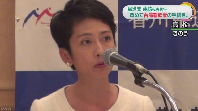 情報源: 民進党 蓮舫代表代行 改めて台湾籍放棄の手続き | NHKニュース