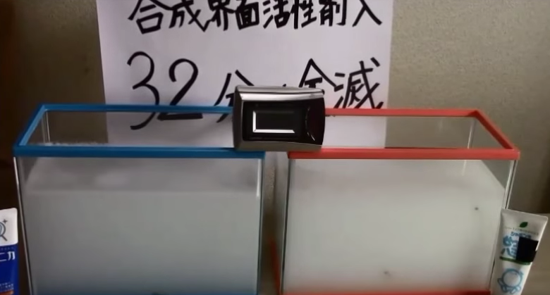 もちろん、ハミガキ水で泳いでいるメダカはいないが、石油系の界面活性剤はメダカのエラ呼吸を停止させることができる。人は口腔の粘膜で呼吸をしていないから、この実験の意図している効果は人間には値しない。