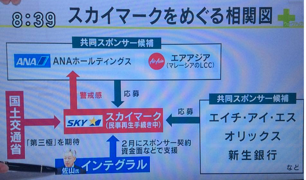 負債総額約3000億円で、民事再生中のスカイマークへ90億円貸付けのスポンサー企業である投資ファンドのインテグラルの佐山展生(さやま・のぶお)代表取締役が出演している。