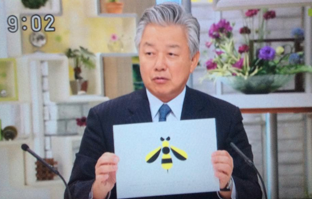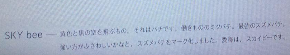 ❏4月4日、本日、佐山展生代表は、よみうりテレビのウェークアップ!プラスで、昨日の会議で出たアイデアの一つであるがと、SKY BEEという社名のアイデアとロゴを披露した。