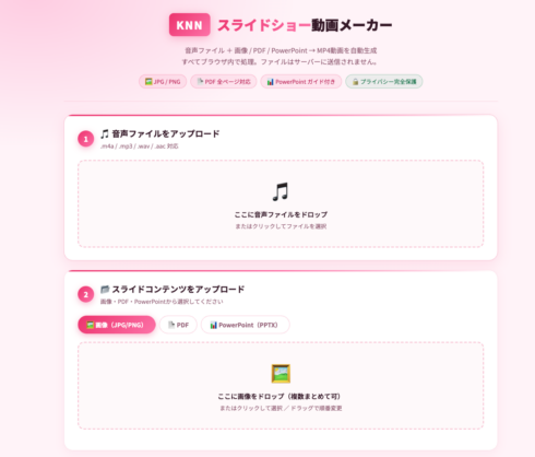 PDFを一旦JPEGにするとか面倒なので、音声ファイルとPDFを投げると、動画に一発にしてくれる KNNスライドーショー動画メーカー つくりました。