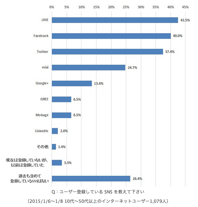 インターネットコムと NTTコム リサーチがインターネットを活用したアンケート調査を定期的に行い、その結果を発表するものである。今回は「SNS利用」について調査した第8回である。調査対象は全国10代~50代以上のインターネット ユーザー1,079人。男女比は男性53.7%、女性46.3%。年代比は10代2.3%、20代27.2%、30代21.5%、40代17.2%、50代以上31.7%。まず、各 SNS にどの程度の登録者がいるか調べてみた。これまでに登録したことのある SNS を複数回答で答えてもらったところ、登録者は