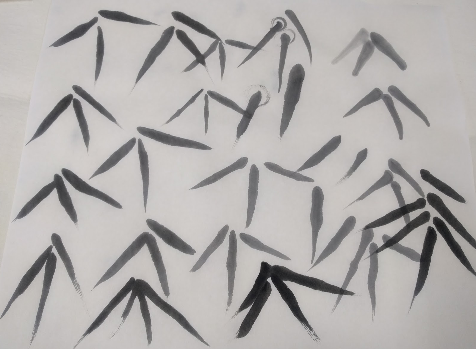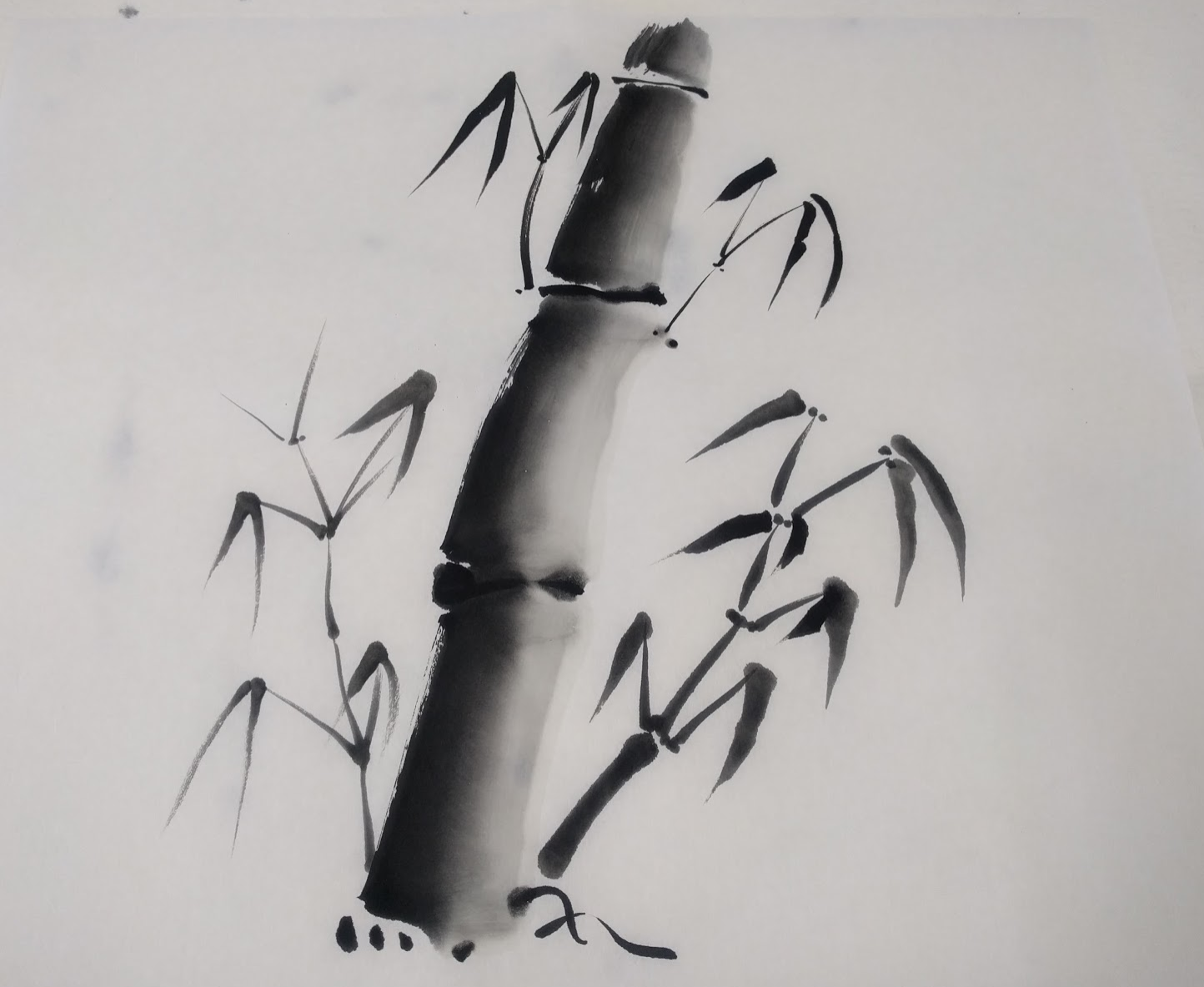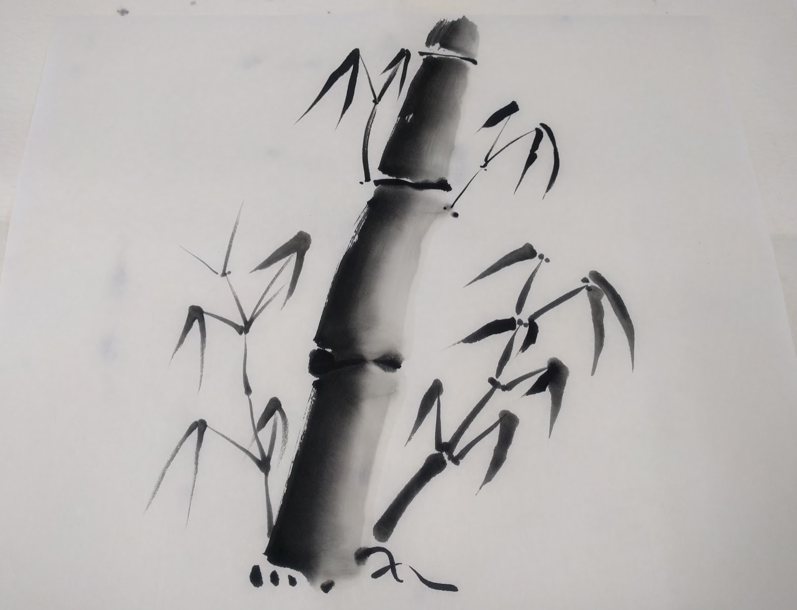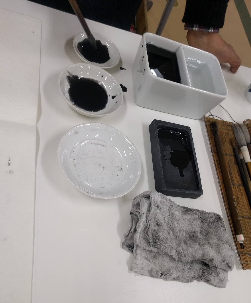 お習字では、墨で擦ったものを水で割ったり、墨汁だと原液の黒で描くことが多いが、水墨画ではそれをさらに水で割り、さらにそれを水で割り、またさらに水で割った、合計4色ほどの墨で表現する。