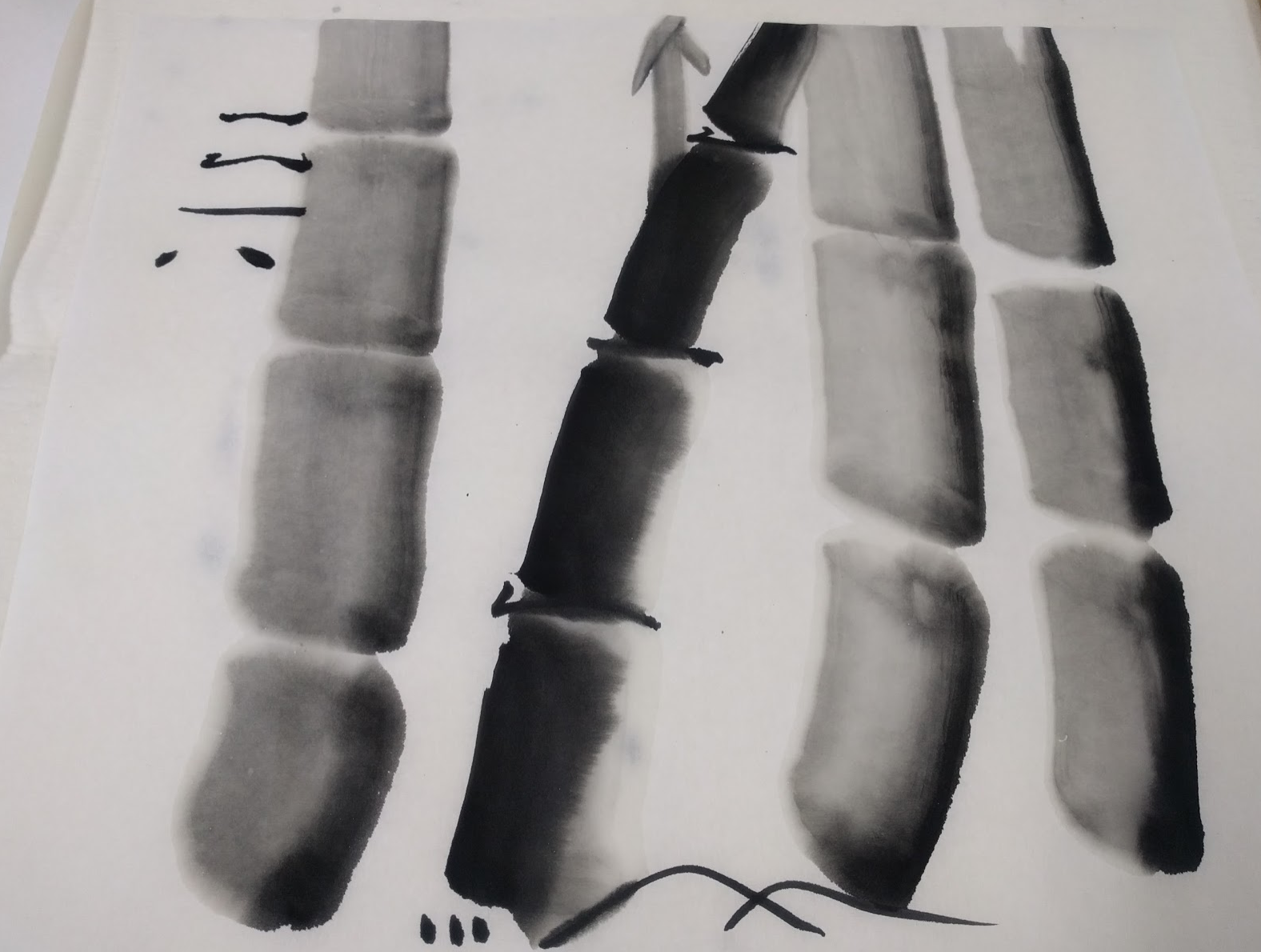 竹の根本は、太筆に薄墨と先端に黒を吸い込ませ、一気に描いていく…。