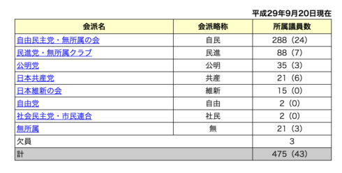 2017年(平成29年)09月20日現在の衆議院議員数