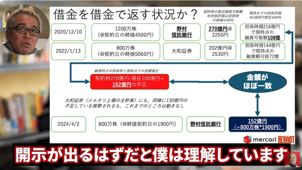 何よりも公開情報で、野村信託銀行からの借り入れが、ほぼメルカリの株の下落による穴埋めにみえるとの推測がすごい。