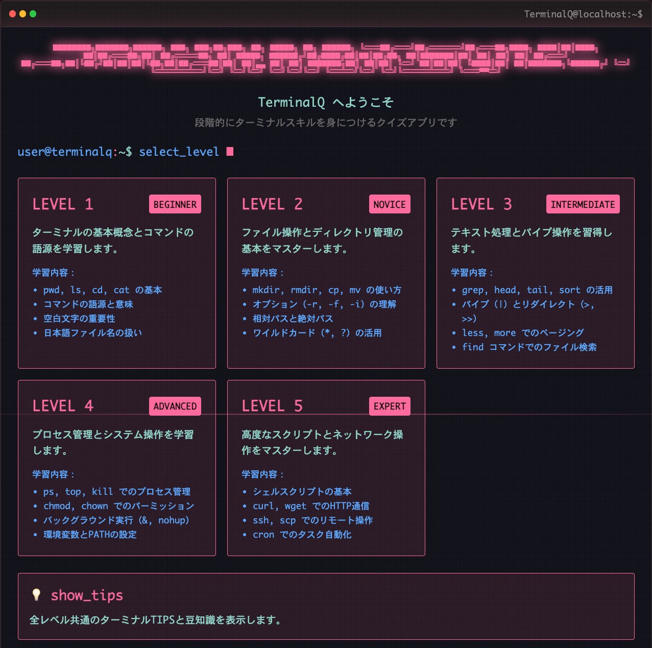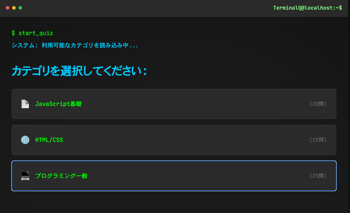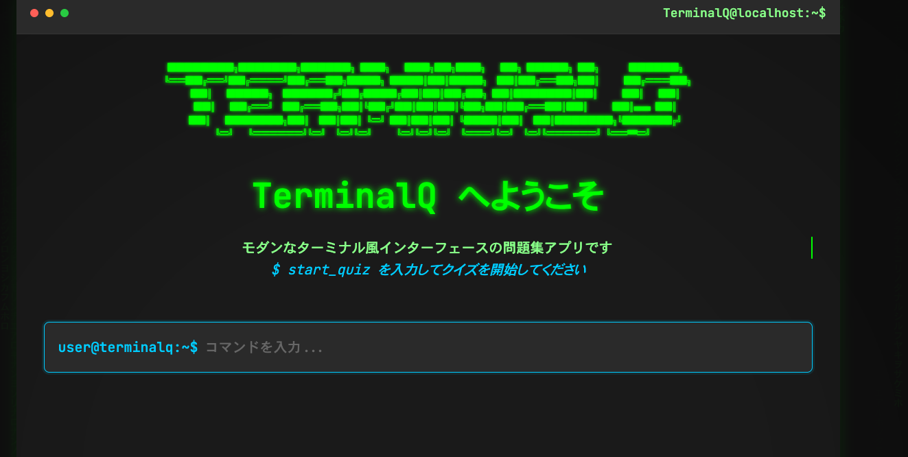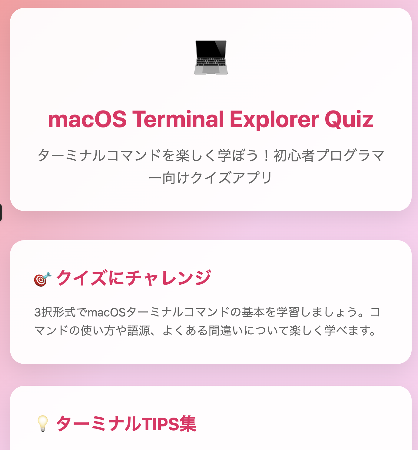 description: "初心者プログラマー向けのmacOSターミナルコマンド学習用Webクイズアプリ。コマンドの基本的な使い方、語源、そして便利なTIPSを3択形式で楽しく学べます。ピンクを基調としたモダンなデザインで、画面のゆらぎやグリッチ効果もあり、 URLアクセスのみで利用可能です。"