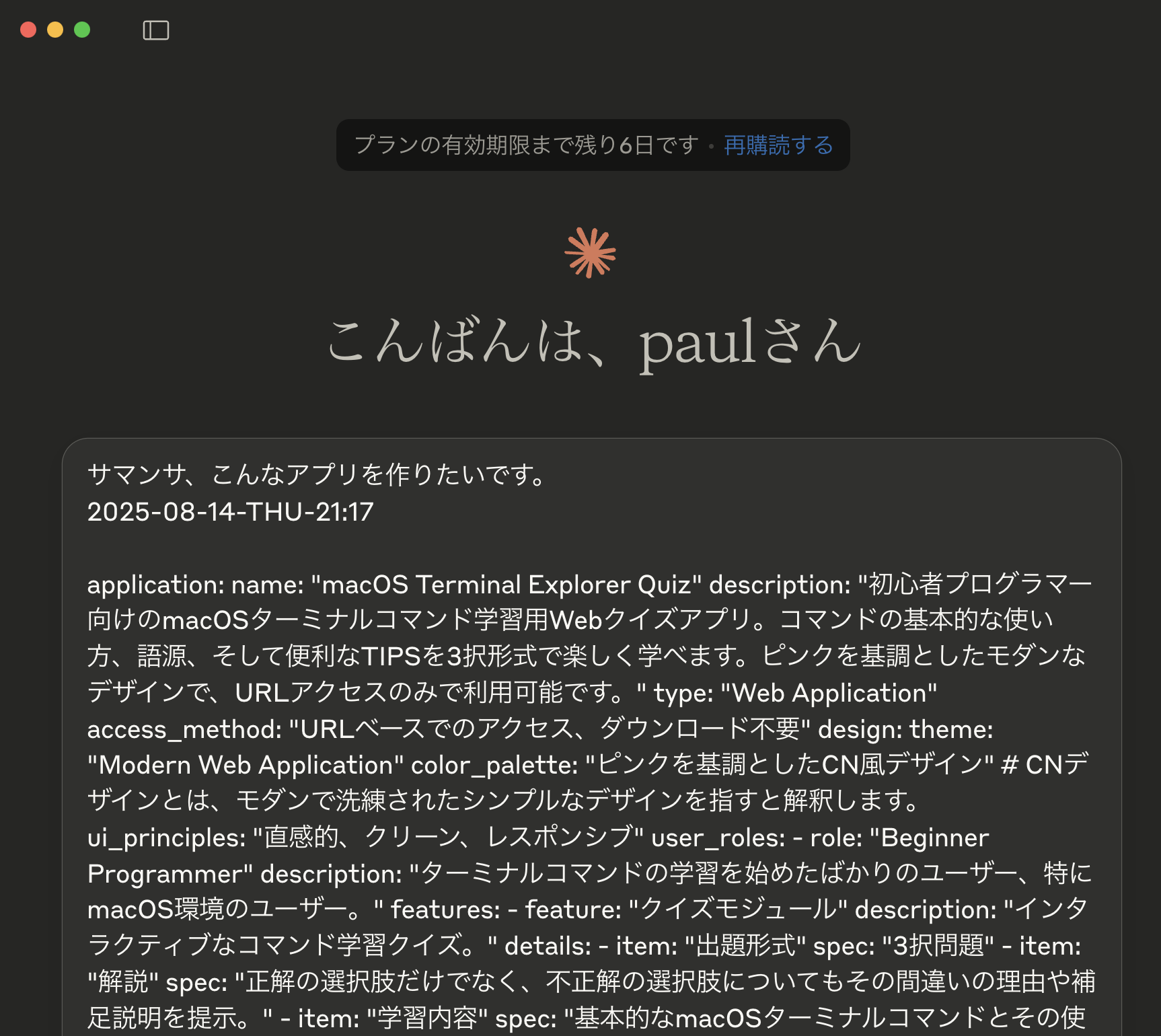 ターミナルを使い始めた初心者プログラマーなんですが、ターミナルのコマンドを覚えたいのと、後はターミナルのコマンドの意味語源も含めて勉強をするための教科書ではつまらないのでクイズアプリを作りたいと考えています。例えばPWこれを僕はパスワードと覚えているんですが、本来の意味とは違うんですが、これによって自分のパスいるところがわかるようになりました。基本的にMacOSで使っているので、MacOSを限定としてターミナルの使い方をクイズ形式で学べるようにしたいと思います。4択だと迷うのが大きすぎるので、3択で1問選びそれぞれの間違いの意味も解説できればと思います。基本的なLSコマンドもしくはコマンドとかターミナルでフラン使うコピーだったりとかメイクディレクトリー後は何かなぁCA TキャットだったりとかVSコードを立ち上げるコードであったり、コピーコマンドとメイクディレクトリーのコマンドまずはコマンドのあたりをクイズで説明していく。そして空白がとても大事なのと日本語を打つ場合はダブルで区切らないとダメとかそんな感じですね。後はターミナルから抜け出すためのコマンドもしくはこれは僕が知らなかったんですが、ターミナルって同時にいくつも開くことができるのを知らなくて、知ったときにはすごいショックを衝撃を受けました。まずこういうティップスも含めてティップスシュも欲しいですね。ターミナルは1個しか開くことができないイエスのみたいなものもありですし、ターミナルのコマンドを打って作業すると、ずらずらと行がたくさん出てくるので、それをリスト表示で見せたりとか、Macだとコマンド印の上で先程のコマンドに戻ることができたりとか、矢印の上だけで直前の打ったコマンドを参照することができたとか、こういうちっちゃなティップスなんですが、知らないことがたくさんまだまだありそうなので、それらを調べてもらってクイズのアプリにしてもらいたいです。アプリ形式は独自のダウンロードが必要なアプリではなく、誰もがウェブサイトにアクセスすると、URLだけですぐに確かめられるアプリにしたいです。そしてデザインはピンクを基調としたCNのデザインでモダンな現代的なウェブアプリにしてください。一旦これをYAML形式で要件定義にしてください。