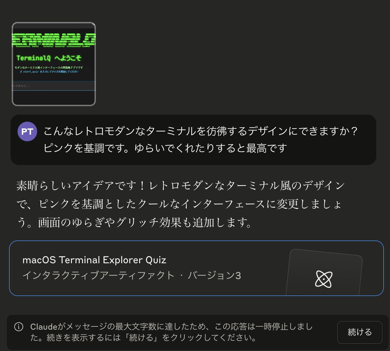 そこで、Claudeコードが最初に提案してくれたレトロモダンなデザインを添付してデザインをし直しをリクエスト。しかしClaudeのメッセージ文字制限にかかりそうです。