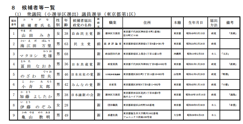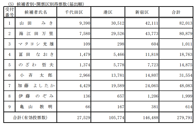 今回の補欠選挙は、新宿区、台東区、大田区、渋谷区において補欠選挙が開催される。