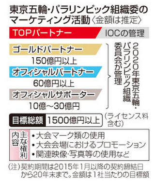 ❏ 組織委のスポンサーはゴールドパートナーなど三つのランクに分かれ、協賛金の総額は1500億円以上を目指している。