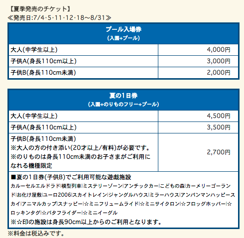 プールの入場券も前提条件のない¥4,000(入園+プール)と¥4,500(入園+プール+のりものフリー)の2種類がある。