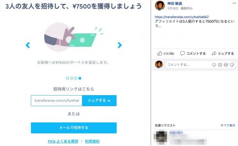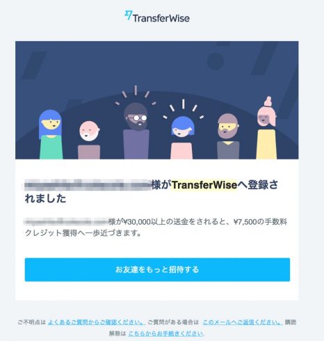 さっそく、○○○さんが30,000円以上の送金をされると ¥7500の手数料クレジット獲得へ一歩近づくという。これは3人集めればということか! すっげーなぁ!TransferWise (トランスファーワイズ)