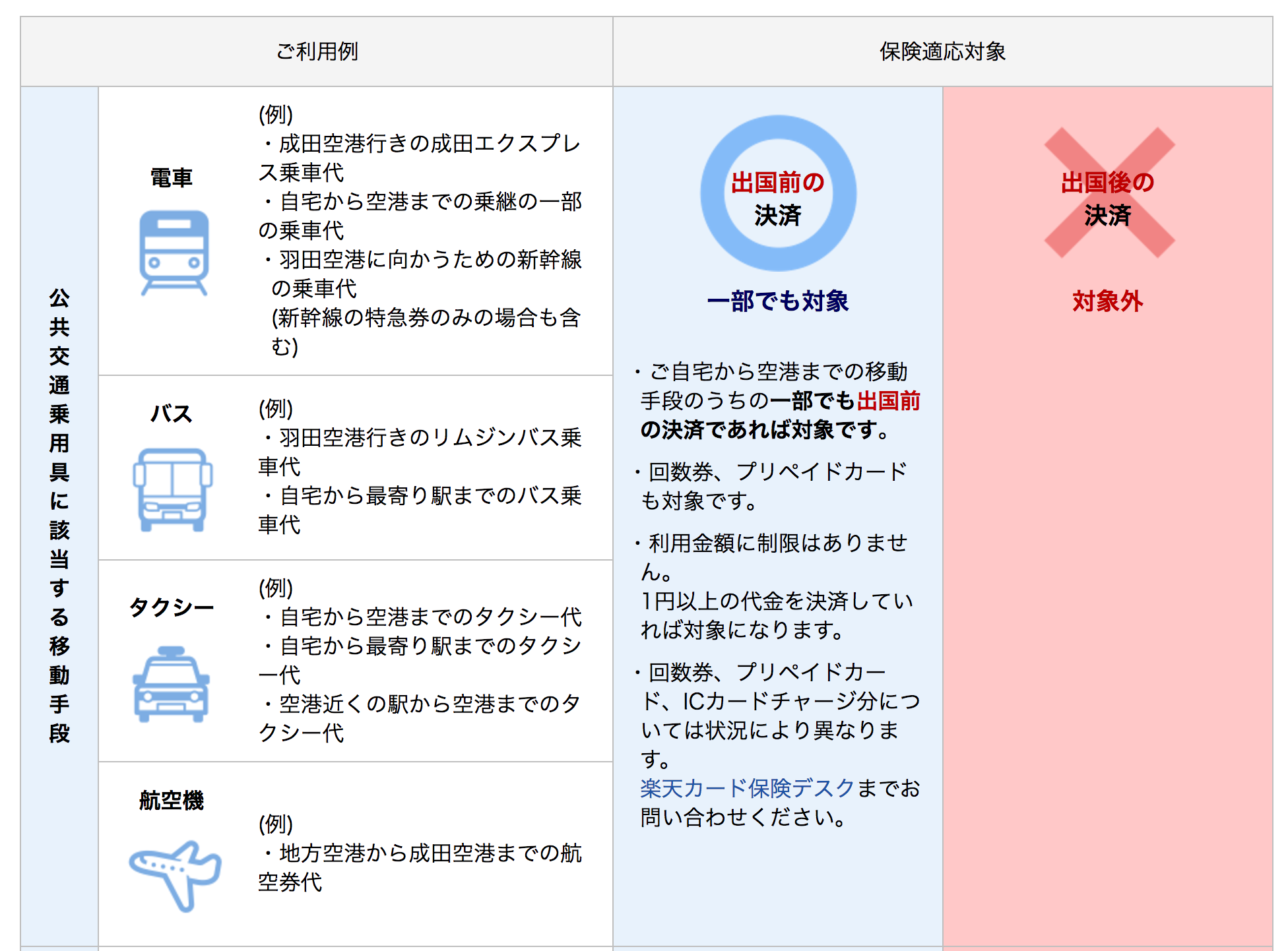 だから、楽天カードの人は、必ず出国前の移動で、楽天カードを保険として使っておきましょう。タクシーの領収書ももっていれば、渡航日に空港へ向かったタクシー(最寄りの駅まででよい)ということの証明になります。