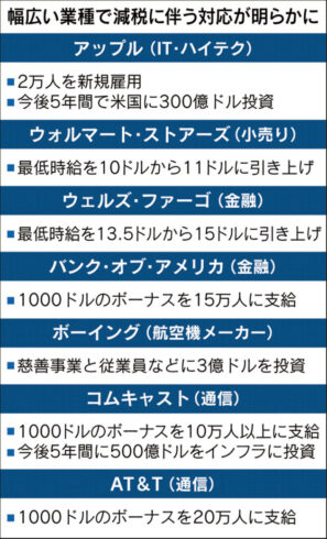 2017年末に決まったトランプ米政権の大型税制改革を受け、米企業が国内投資と雇用増に一気に動き始めた。アップルは17日、300億ドル(約3兆3千億円)を米国内で投資すると表明。