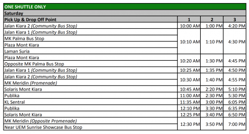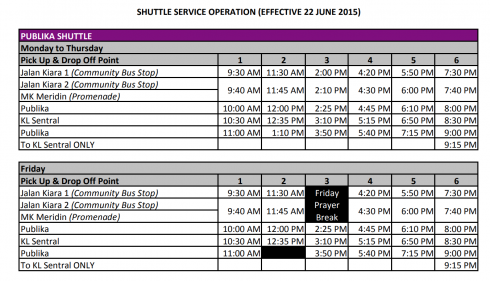 KNNコンドミニアムのあるKDSから Jalan kiara 1 のバス停は、徒歩で10分以上かかる。しかし、お散歩ついでにシャトルで回ってみるのもありだ。Publika まで歩くことを考えればあり。ちなみにPublikaには徒歩だと、30分以上かかる。ウォーキングエクササイズコースとしてはありかと…。