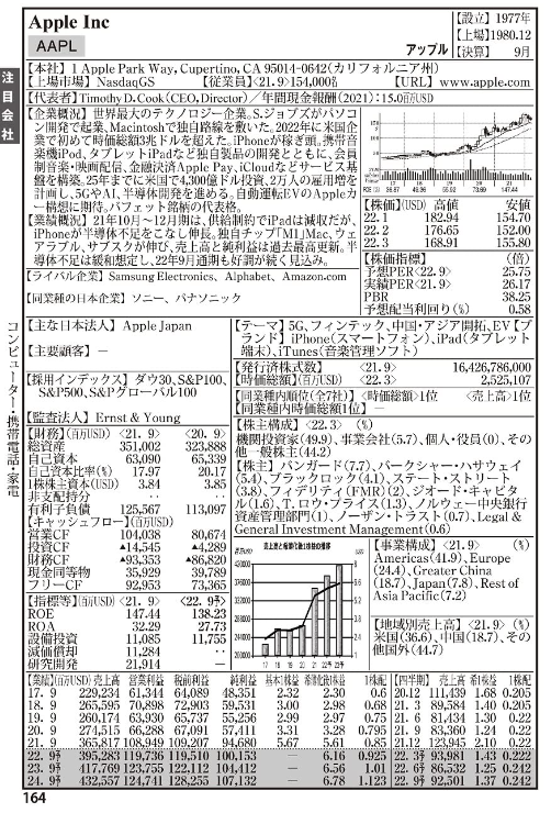 ホームニュース 米国会社四季報 2022年春夏号 2022年06月28日 火曜日 SHARE ポスト シェア はてブ LINE 米国上場企業の詳細、だけでなく、日本における同業者も掲載されており、比較ができる。 Appleの場合は、同業種の日本企業としては、ソニーやパナソニックらしい。 https://amzn.to/39X5GZD Views: 0
