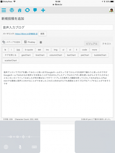 ワードプレスの音声入力機能を使って入力してみればなんとiPad miniでも簡単に音声入力をすることができましたこれだと歩きながらでも発想まとめてブログをアップすることができそうです