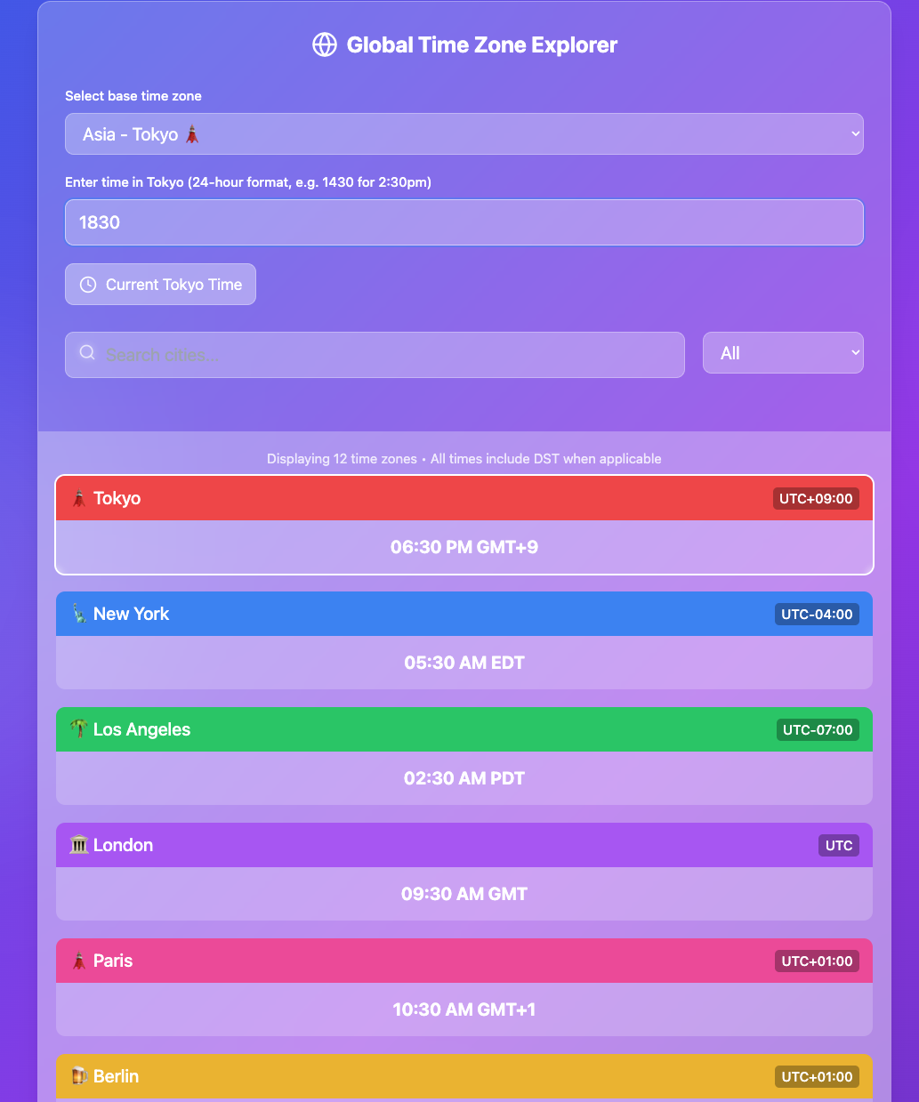 複数の都市を含むグローバル時間コンバータ