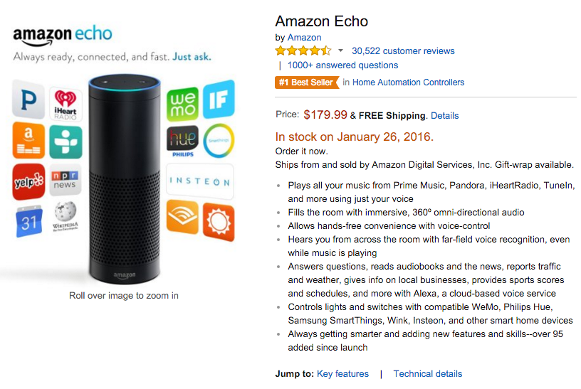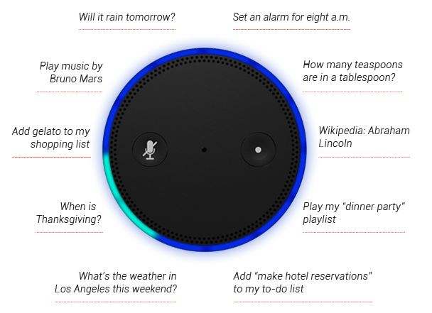 ■Echoで利用できる機能には、アマゾンの音楽配信サービスなどからの音楽再生や、同社傘下のオーディオブックサービス「オーディブル(Audible)」のコンテンツ再生、ラジオ局のニュース、天気予報の再生、アラーム、タイマー、Wikipediaの情報検索、To-doリストやアマゾンのショッピングリストへのアイテム追加などがある。